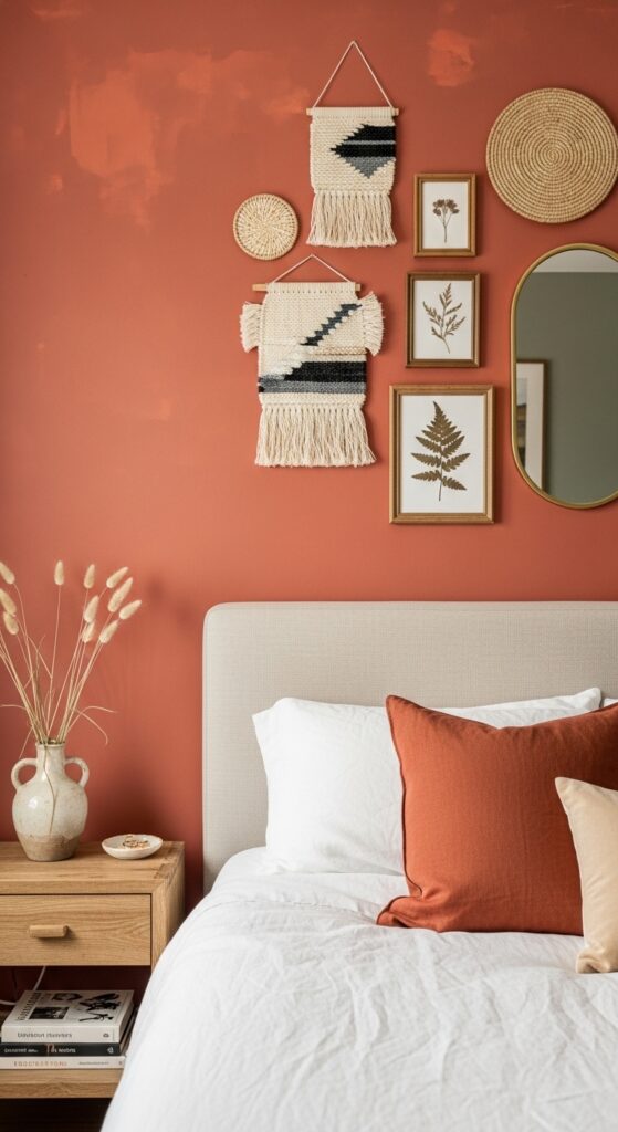 How to get it: Use Farrow & Ball ‘Red Earth’ or Sherwin-Williams ‘Cavern Clay’ (SW 7701) for that dusty, matte terracotta — both have the slightly muted finish that reads boho rather than southwestern. Arrange your gallery pieces on the floor first and photograph the layout before committing a single nail to the wall.