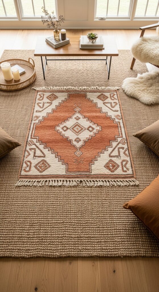 Why it works: Layering rugs is a core boho technique, and jute is the ideal base because its flat, neutral texture lets the top rug become the star without visual competition. The contrast between the rough, natural jute and the softer pile of a Moroccan or kilim rug creates tactile interest that a single rug can’t achieve. It also adds acoustic warmth — layered textiles significantly soften sound in hard-floored rooms.