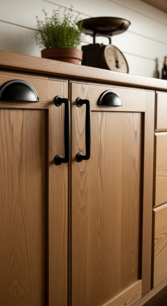 Why it works: Matte black iron hardware against warm wood creates one of the most effective contrast pairings in farmhouse design — the dark metal grounds the honey warmth of the wood without competing with it. “Matte” is non-negotiable here; polished black reads contemporary rather than rustic. The slight variation in iron cup pulls, especially handcrafted ones, carries the boho spirit of imperfection into an otherwise structured space.