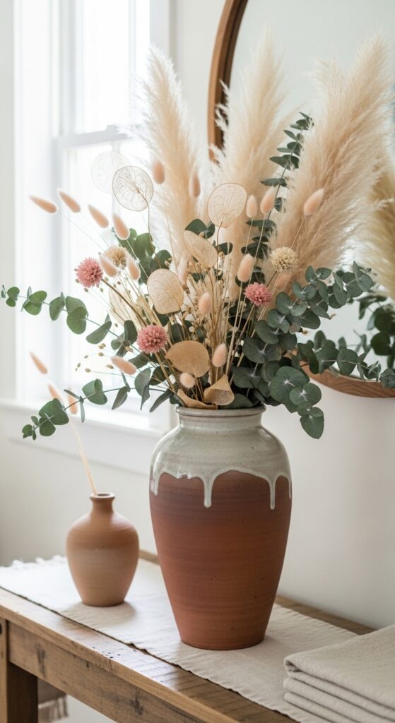 Why it works: Dried botanicals solve a problem fresh flowers create: impermanence. Pampas grass, bunny tails, and dried lunaria hold their form and color for months, making them one of the most practical accessories in a boho farmhouse home. They work on the same neutral-warm color spectrum as the rest of the palette, so they integrate rather than punctuate. A full, generous arrangement reads more intentional than a sparse one — volume is part of the aesthetic.