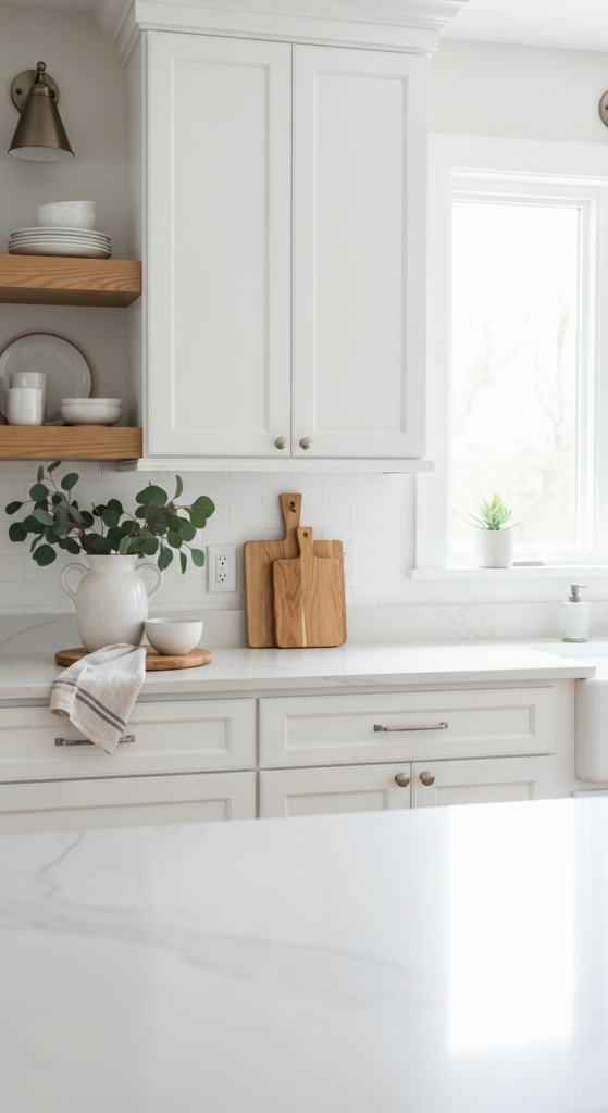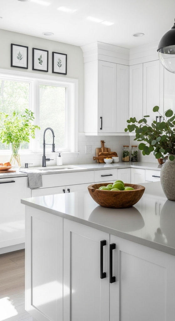 Crisp matte white Shaker cabinets keep it classic, while styling stays airy and current.