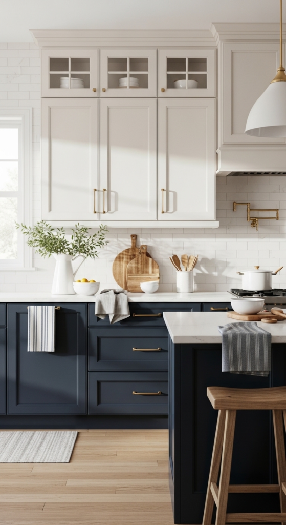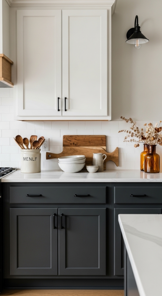 Two-tone cabinetry adds instant depth—dark base cabinets ground the space without feeling heavy