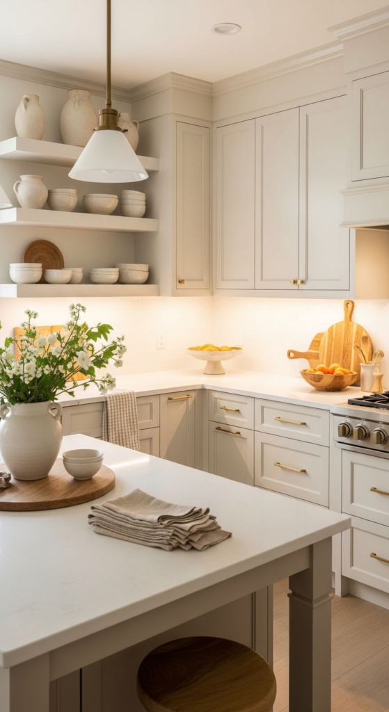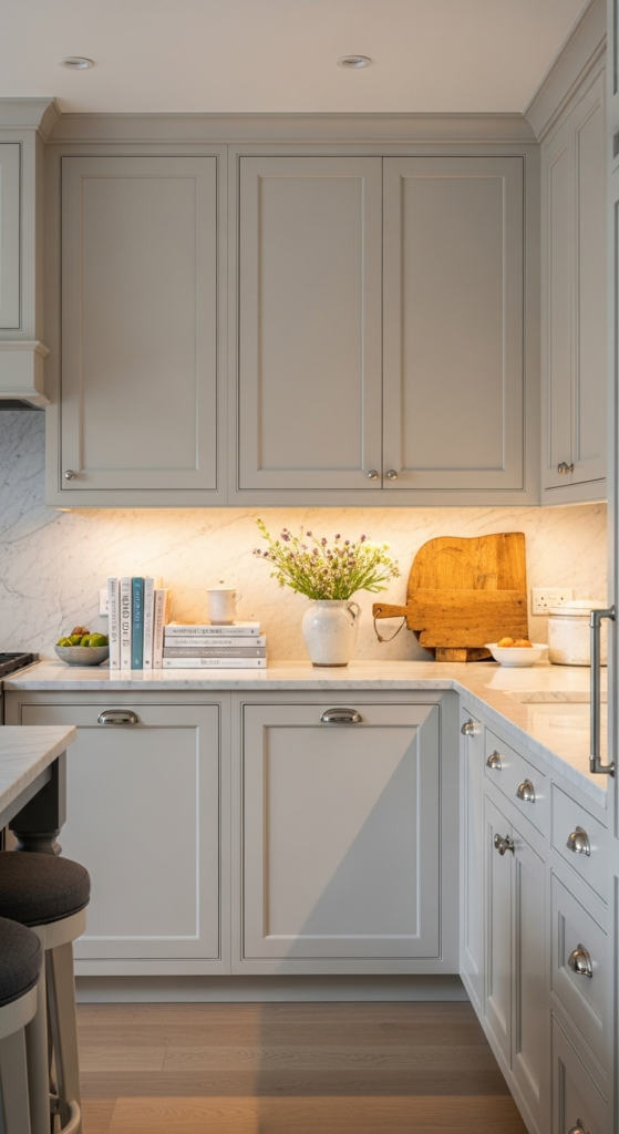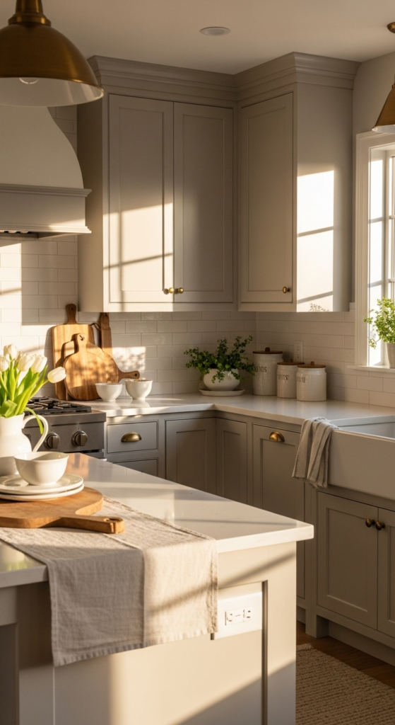 Taupe cabinets read sophisticated and cozy—ideal if you want warmth without going too dark.