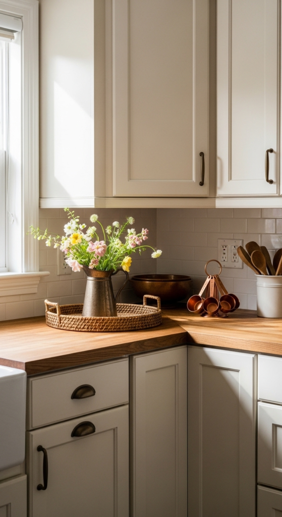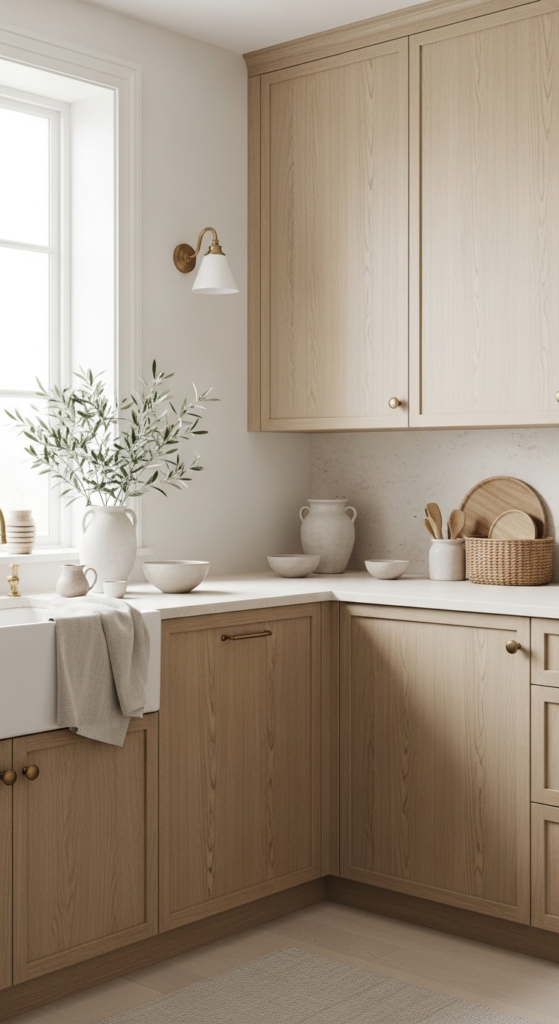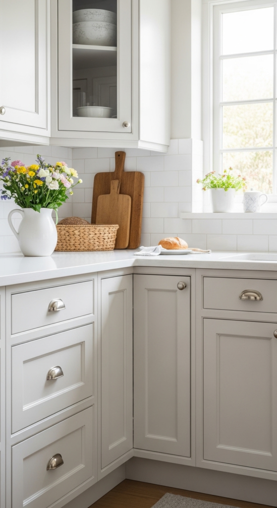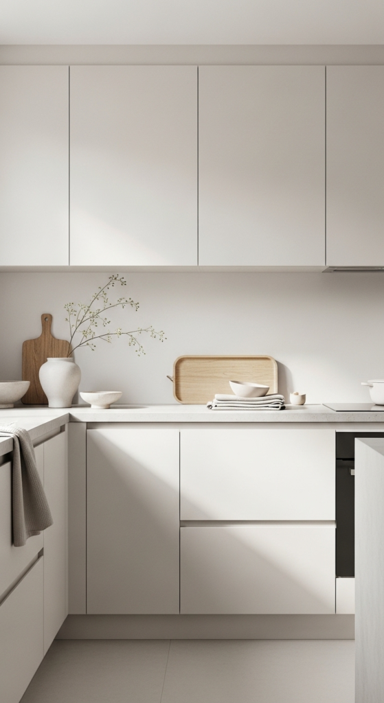 Cream flat panels feel modern and calm—perfect backdrop for rustic ceramics and warm woods.