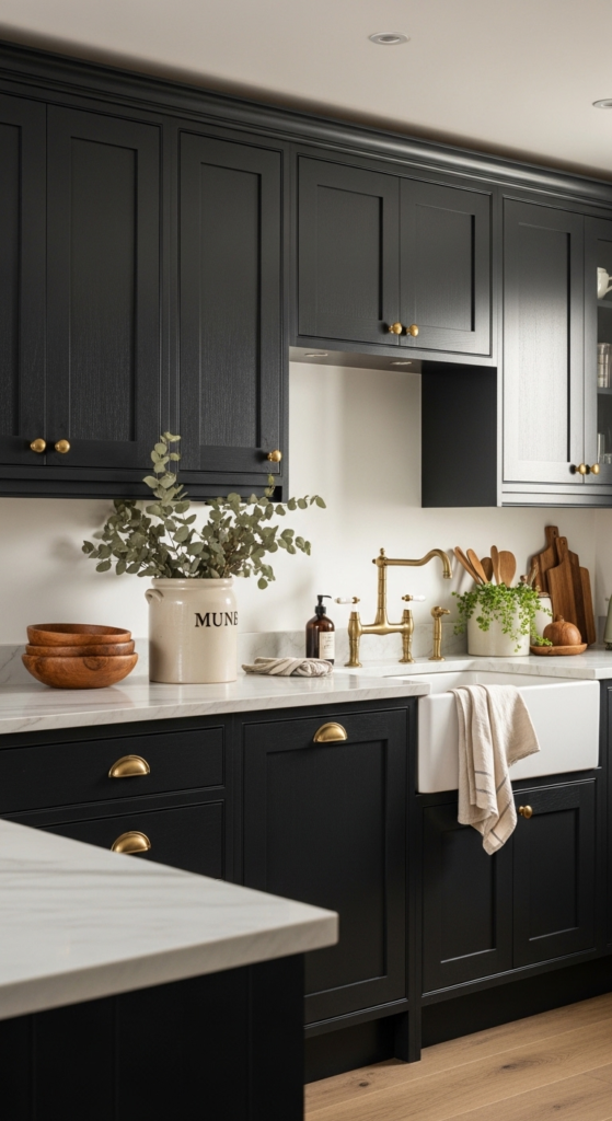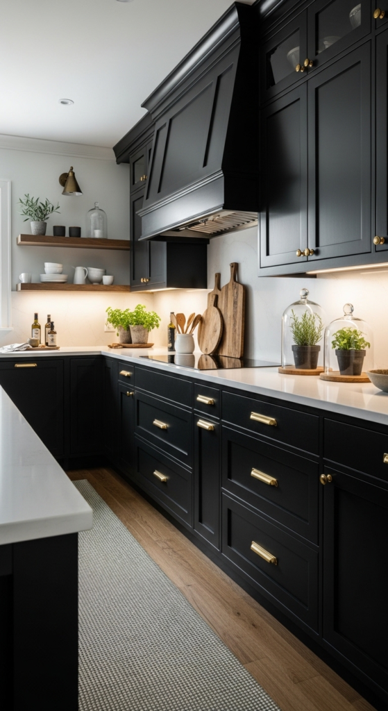 Matte black cabinetry feels bold and tailored—soften it with warm, rustic decor accents.