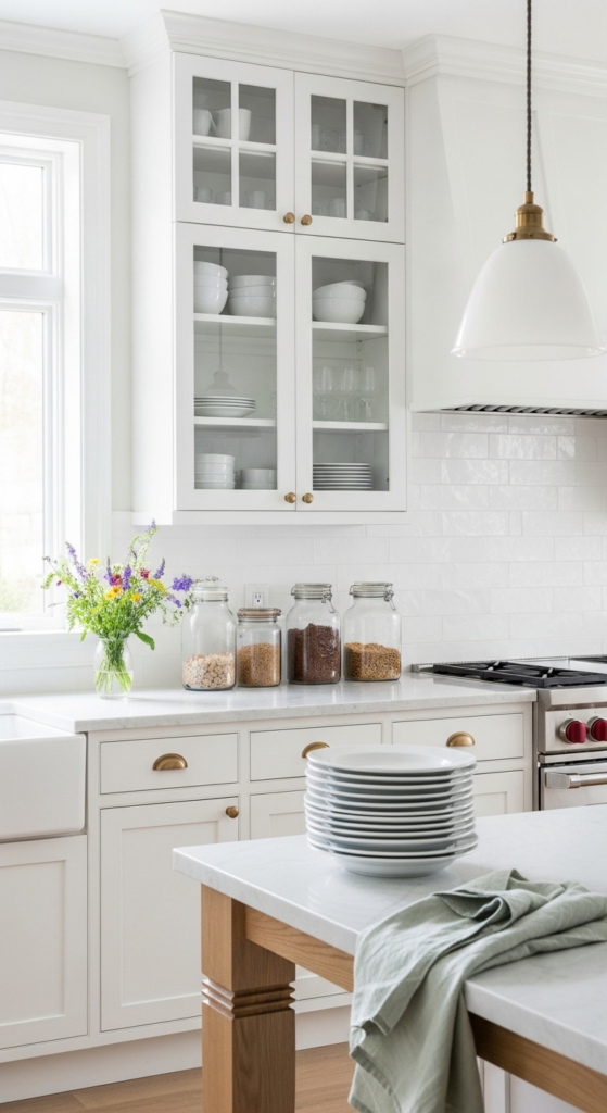 Glass-front cabinet doors keep everything feeling open—style with neutral dishware for calm charm.
