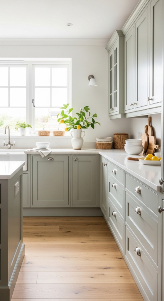 Soft gray cabinets feel timeless and peaceful—perfect for layering rustic wood and cozy linens.