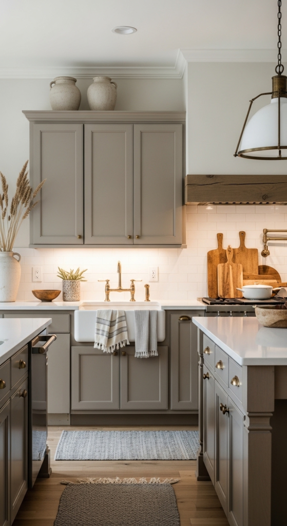 Greige cabinets read modern and soothing—perfect for blending rustic textures without harsh contrast.