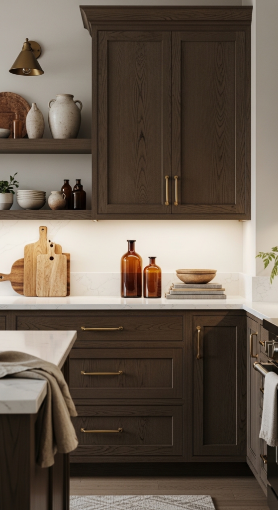 Deep-stained wood cabinets feel rich and grounded—pair with lighter counters for modern contrast.