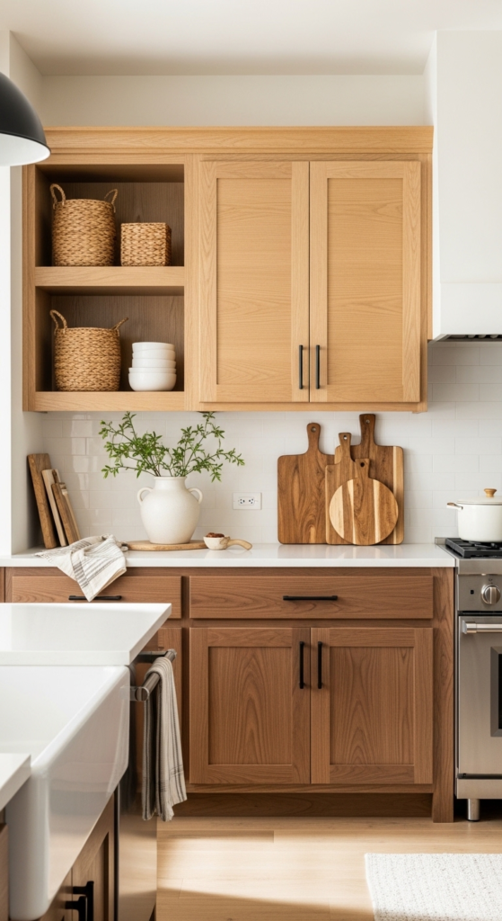 Blend two wood tones across cabinets for a curated, modern farmhouse feel with rustic depth.