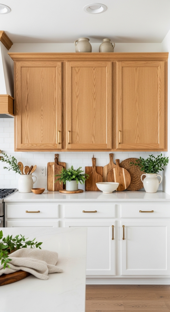 Wood uppers bring warmth at eye level, while painted lowers keep the look clean and current.