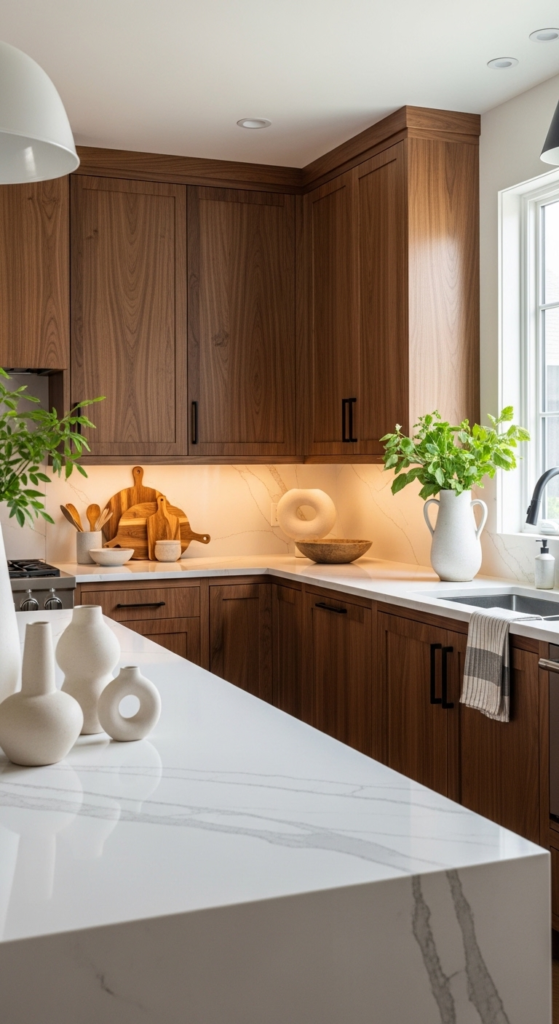 Walnut cabinets bring instant richness—light stone keeps it contemporary, bright, and balanced.