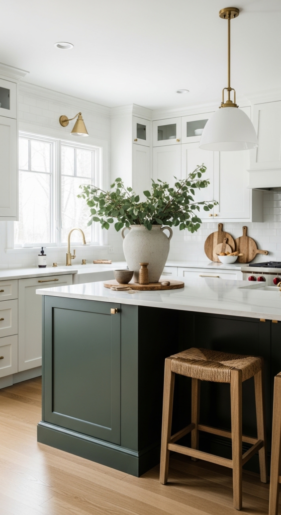 Olive cabinetry feels earthy and elevated—perfect for a modern farmhouse that’s calm and grounded.