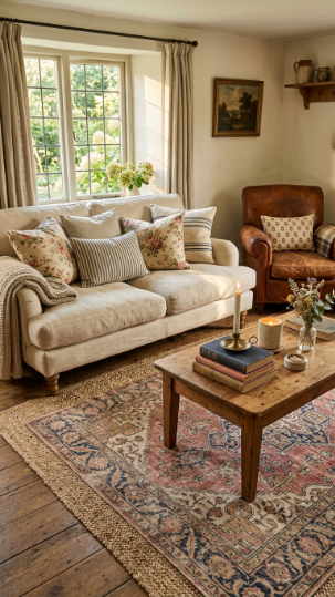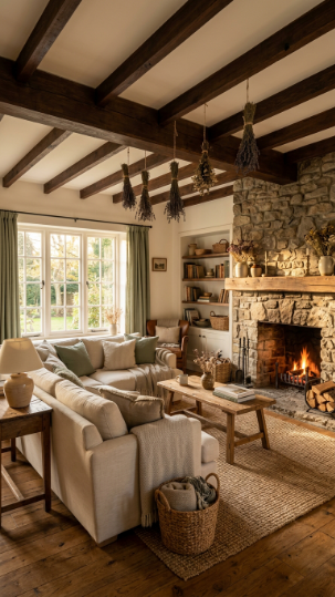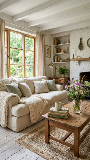 Picture soft linen sofas, weathered wood beams, wildflowers on a scrubbed pine table, and afternoon light spilling through gauzy curtains. It’s the kind of living room you never want to leave.