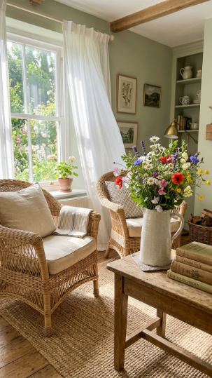 Wicker furniture and loose wildflower arrangements bring the garden straight into your living room.