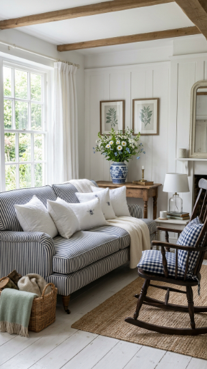 Navy and white toile or stripe patterns mixed with fresh botanicals feel timelessly cottage-perfect.