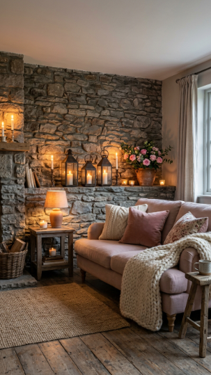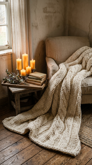 A corner piled with oversized chunky knit throws and flickering candles is the coziest cottage moment.