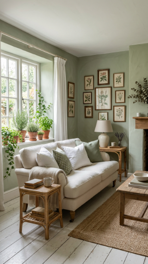 Soft sage green walls wrap the whole room in a calm, botanical cottage farmhouse embrace.