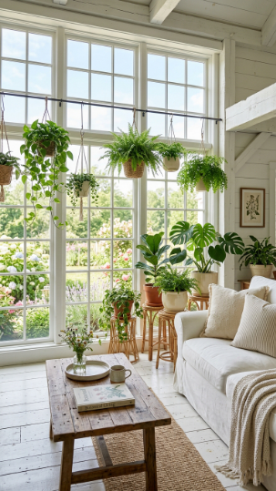 Floor-to-ceiling windows flooded with light and trailing plants make the room feel alive and lush.