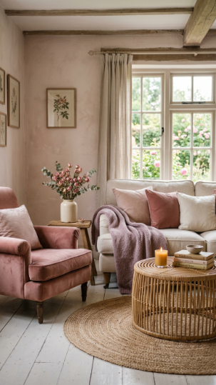 Blush and cream tones layered together create a living room that feels like a gentle afternoon dream.