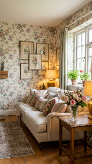 Bold floral wallpaper, layered cushions, and collected antiques make this room joyfully maximalist.