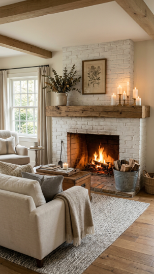 Whitewashed brick fireplace with a simple wood mantel is the undeniable heart of this cozy room.