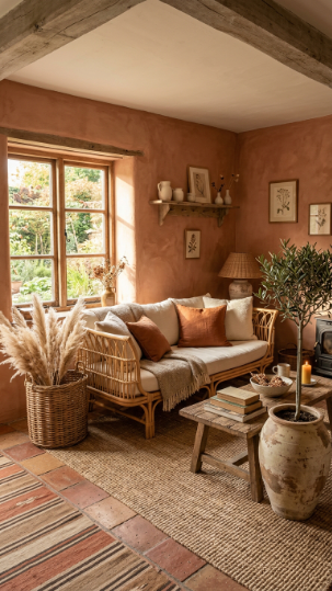 Warm terracotta walls and rattan furniture give this room sun-soaked, Mediterranean cottage energy.