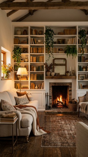 Built-in white bookshelves flanking the fireplace make this room feel like a beloved literary cottage.