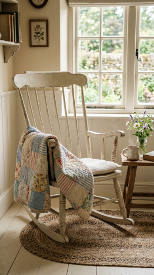 A handmade quilt draped over a painted rocking chair is cottage farmhouse storytelling at its finest.