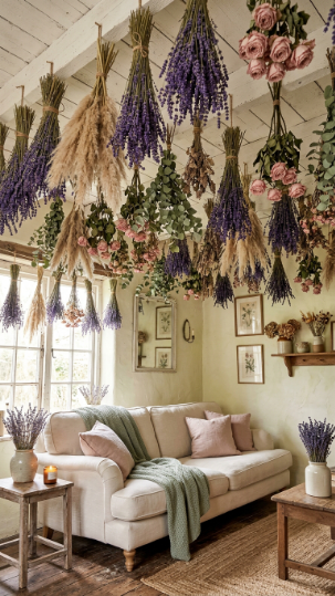 Bunches of dried flowers hung from ceiling hooks create a dreamy, bohemian cottage canopy above.