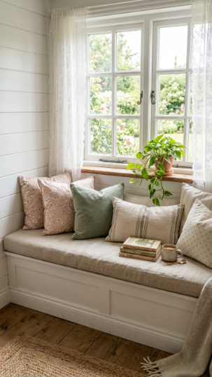 A deep built-in window seat piled with cushions is the ultimate cottage farmhouse daydream spot.