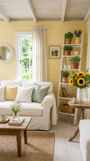 Warm butter yellow walls and white linen fill this cottage living room with pure sunshine joy.