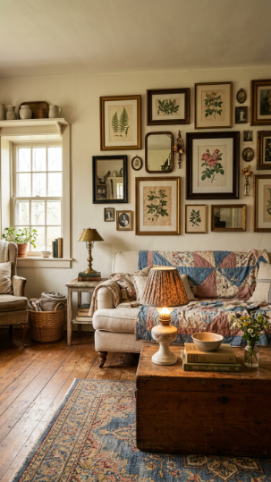 Collected antique finds, mismatched frames, and layered textiles make this room feel curated over decades.