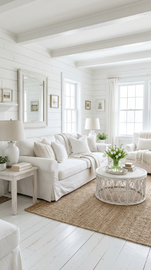 A fully white living room with texture-heavy layering feels like breathing in fresh country air.