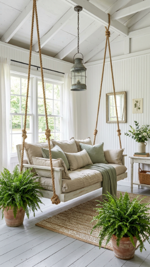 Beadboard walls, a porch swing repurposed as seating, and potted ferns blur indoor-outdoor cottage charm.