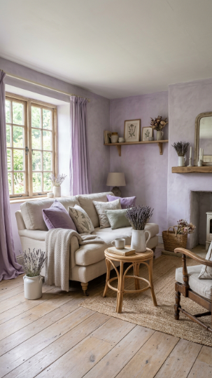 Soft lavender accents woven through natural linen create a room that smells like a French countryside cottage.