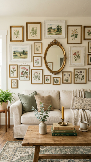 A carefully curated gallery wall of prints, pressed botanicals, and vintage mirrors tells a beautiful story.