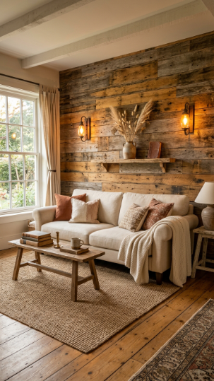 A full wall of reclaimed barn wood brings texture, history, and soul into the cottage farmhouse living room.