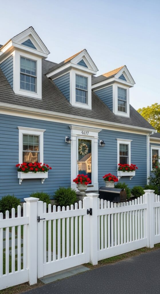 What makes it work: Dusty steel blue — softer and slightly greyer than pure navy — suits the Cape Cod’s modest, welcoming character perfectly. It’s strong enough to read clearly against green lawns and blue skies, but soft enough to feel approachable rather than dramatic. Red geraniums pop against it with extraordinary vibrancy.