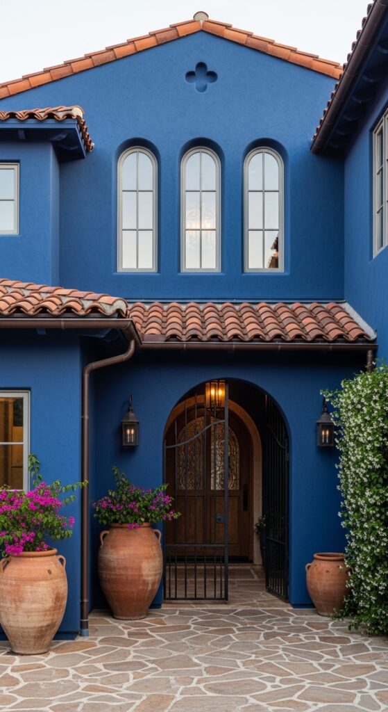 What makes it work: The combination of deep blue stucco and terracotta roof tiles is one of the most powerful color stories in Mediterranean architecture, drawing on centuries of North African and Southern European building tradition. The blue deepens and cools the terracotta’s warmth into something balanced and visually arresting.