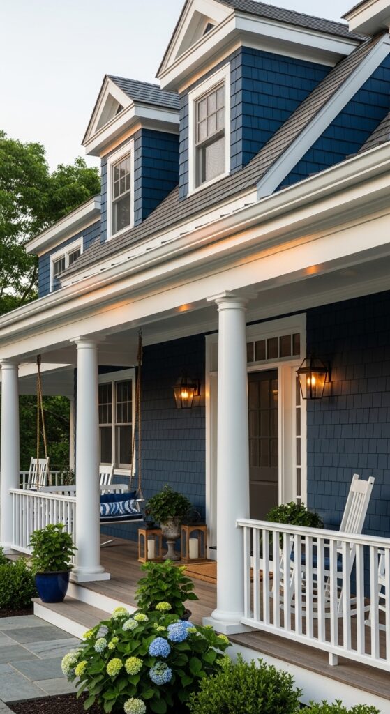 What makes it work: Cedar shingles painted navy have a dimensional texture that flat siding cannot replicate — each shingle’s individual edge catches light differently, creating a surface that is never flat or dull. On a shingle-style house, navy blue reads as the natural evolution of the traditional stained cedar shingle, simply at its most saturated.