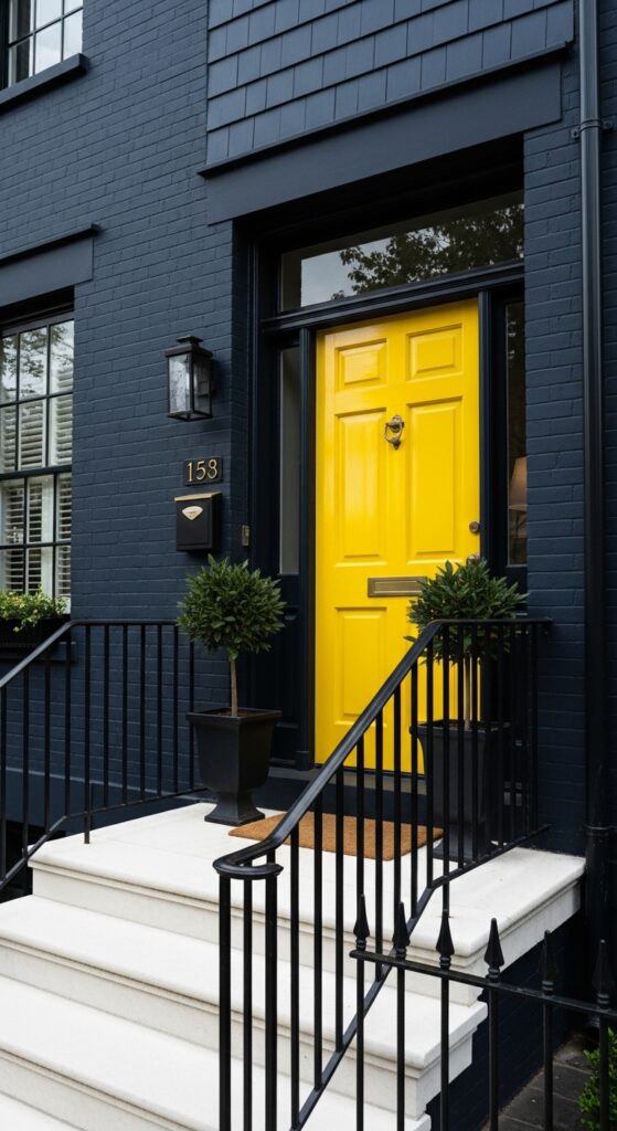 How to achieve it: Choose a high-gloss finish for the yellow door — it reflects light and emphasizes the vibrancy of the color. Benjamin Moore “Sun-Kissed Yellow” or Farrow & Ball “Babouche” are both proven high-performing yellow door colors that read as warm and welcoming rather than harsh.