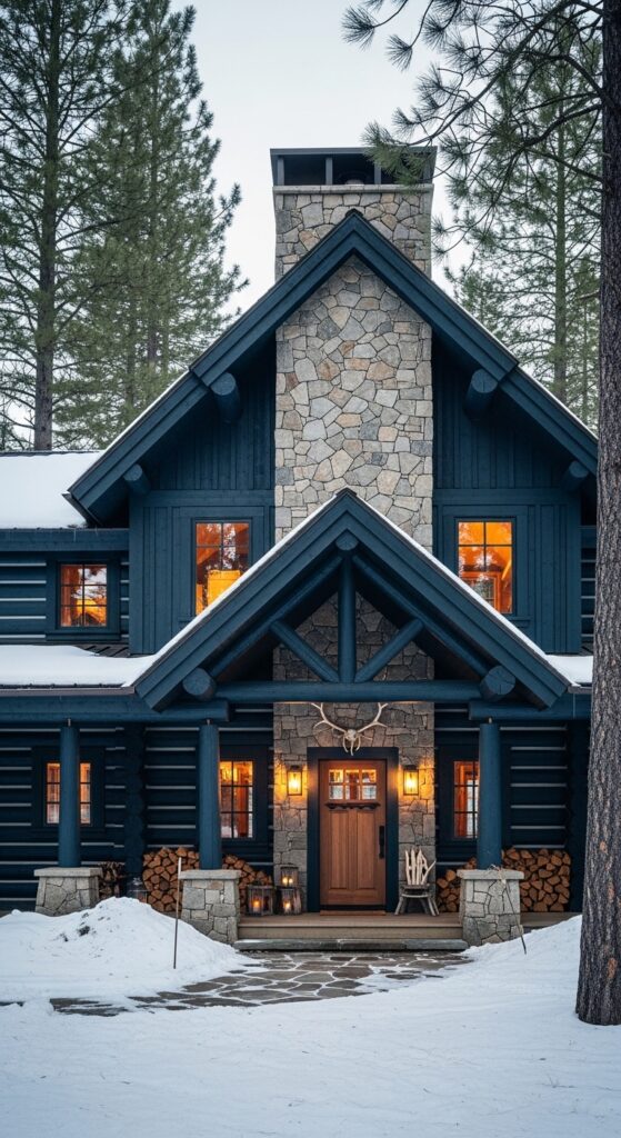 How to achieve it: Use a penetrating log stain rather than film-forming paint on log homes — it allows moisture movement through the wood without peeling. Sashco’s “Capture” or Sansin’s “Timber Shield” in deep navy tones are designed specifically for log construction and provide UV protection that standard paint cannot.