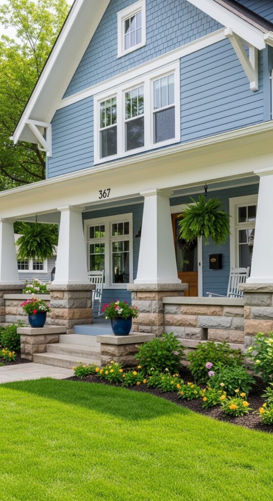 How to achieve it: Benjamin Moore “Wedgewood Gray” or Sherwin-Williams “Watery” produce a beautiful powder blue that shifts between blue and grey depending on the light — especially effective on craftsman homes where the warm stone pier bases provide grounding contrast.