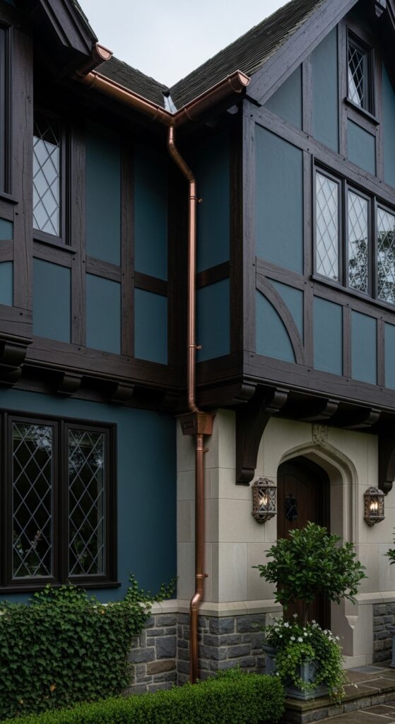 What makes it work: Blue-green occupies the border between navy and forest green, and against the warm brown of half-timber framing it creates an extraordinarily rich, complex combination. Copper gutters develop verdigris over time — the natural green patina becomes its own design accent that reinforces the blue-green body color.