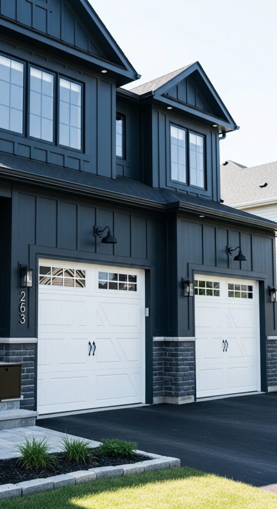 What makes it work: In many suburban homes, the garage doors occupy the largest single visual area on the facade. Making them bright white against a dark navy body creates a powerful, deliberate graphic contrast that prevents the large dark mass from feeling oppressive and provides a visual anchor the eye immediately finds satisfying.