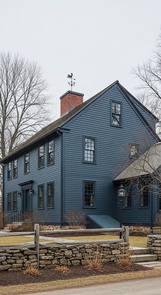 How to achieve it: Farrow & Ball “Stiffkey Blue” or Benjamin Moore “Polo Blue” both produce the dark blue-grey needed to honor a saltbox’s historic character. Avoid any paint with obvious purple undertones — they read as anachronistic on colonial-era architectural forms.
