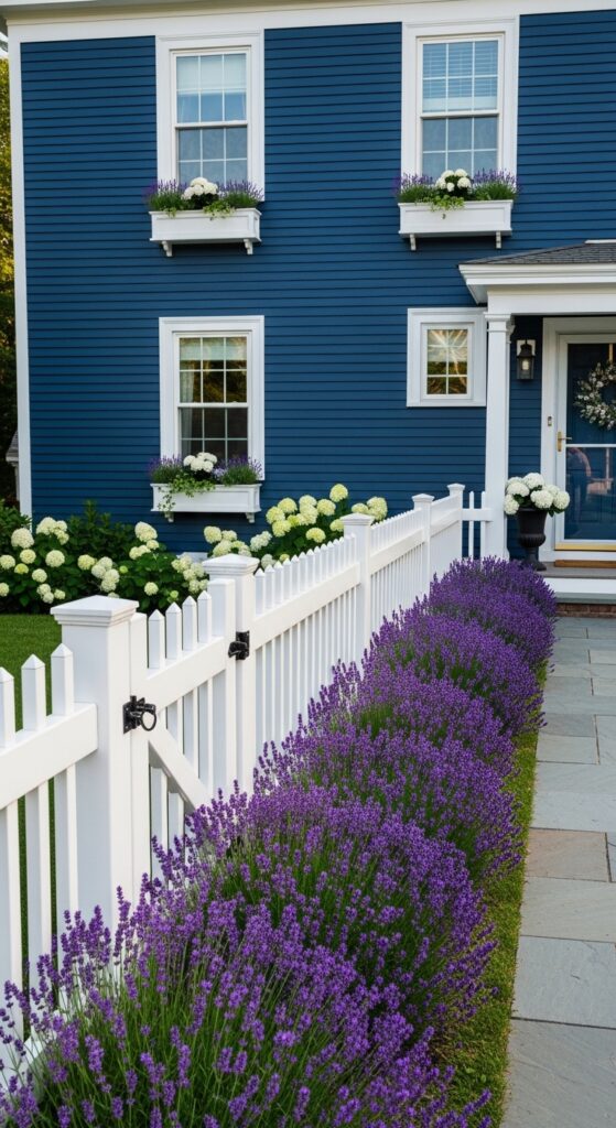 What makes it work: Lavender planted along a white fence against a deep blue house creates a layered color story of extraordinary harmony — blue, white, and purple are naturally related tones that build on each other. The white fence prevents the lavender from being lost against the dark wall behind it, giving the border a crisp frame.