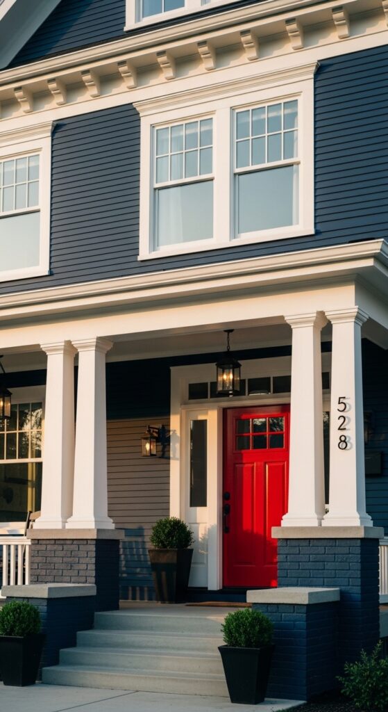 What makes it work: The classic navy-white-red combination is one of the most enduring in residential design, with the red door providing a single high-energy accent that keeps the predominantly dark facade from feeling heavy. The wide white trim on craftsman detailing gives the eye a crisp architectural outline to follow.
