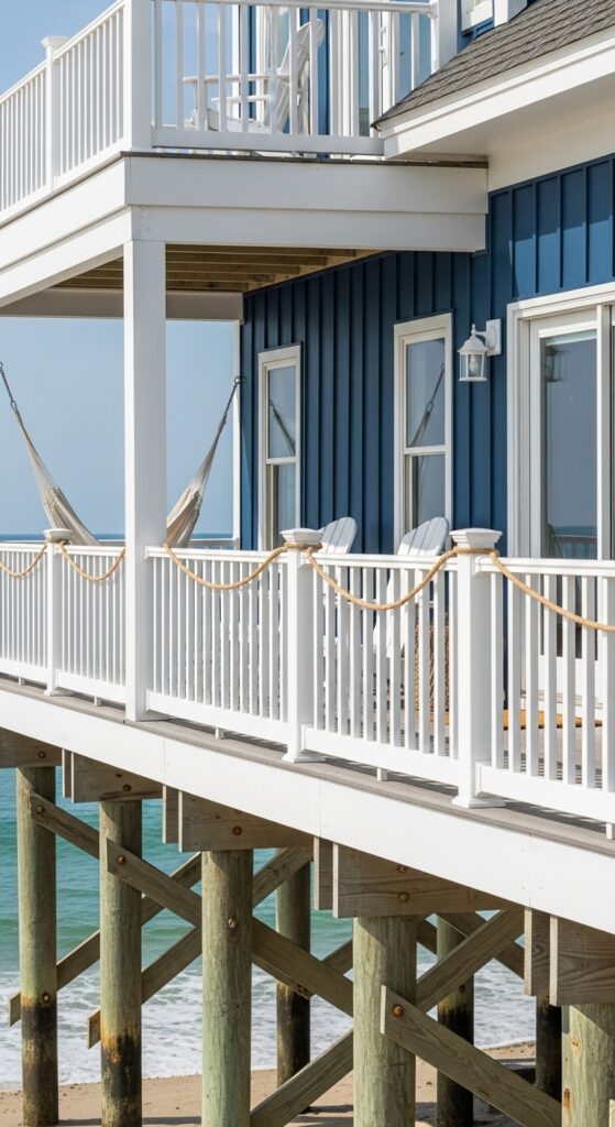 20. Coastal Navy Blue Beach House on Stilts with White Railings